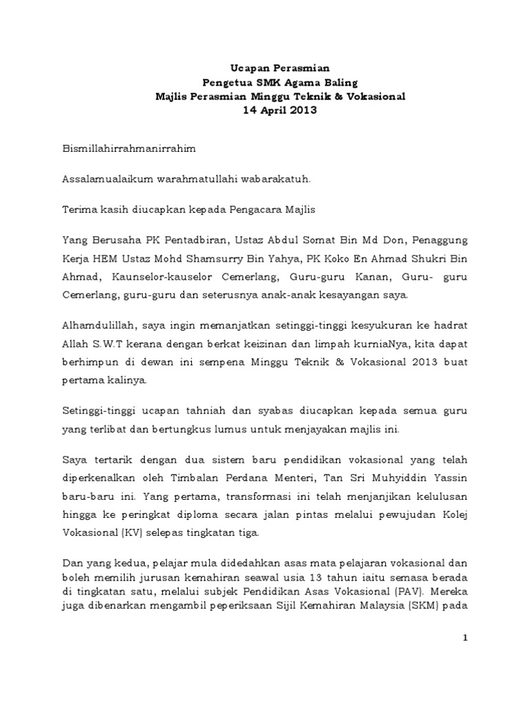 Pembukaan Penutup Ucapan. RPT Pendidikan Islam Tahun Satu MINGGU 10 KSSR 2017 RPT Pendidikan Islam Tahun Satu MINGGU 11 KSSR 2017 RPT Pendidikan Islam Tahun Satu MINGGU 12 KSSR. Contoh Teks Ucapan Perasmian Minggu Bahasa Melayu - Teks Ucapan Perasmian Bulan Kebangsaan Peringkat Sekolah.